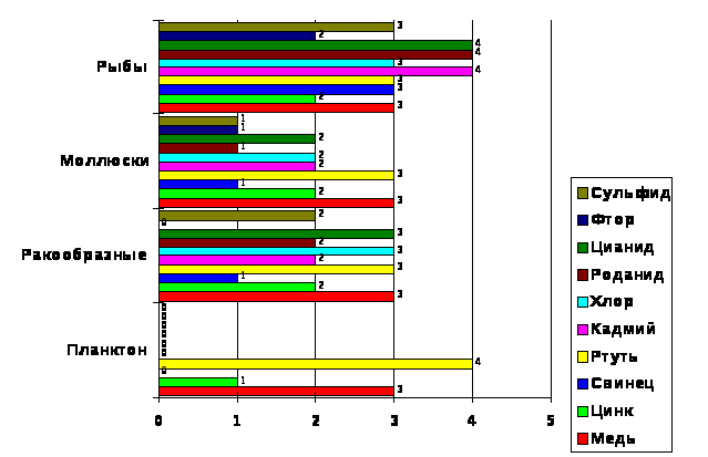 Основными неорганическими (минеральными) загрязнителями пресных и морских вод являются разнообразные химические соединения, токсичные для обитателей водной среды. Это соединения мышьяка, свинца, кадмия, ртути, хрома, меди, фтора. Большинство из них попадает в воду в результате человеческой деятельности. Тяжелые металлы поглощаются фитопланктоном, а затем передаются по пищевой цепи более высокоорганизованным организмам. Токсический эффект некоторых наиболее распространенных загрязнителей гидросферы представлен на рисунке 2: