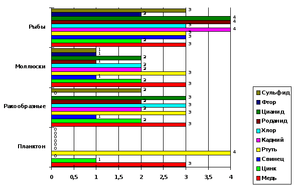 Основными неорганическими (минеральными) загрязнителями пресных и морских вод являются разнообразные химические соединения, токсичные для обитателей водной среды. Это соединения мышьяка, свинца, кадмия, ртути, хрома, меди, фтора. Большинство из них попадает в воду в результате человеческой деятельности. Тяжелые металлы поглощаются фитопланктоном, а затем передаются по пищевой цепи более высокоорганизованным организмам. Токсический эффект некоторых наиболее распространенных загрязнителей гидросферы представлен на рисунке 2: