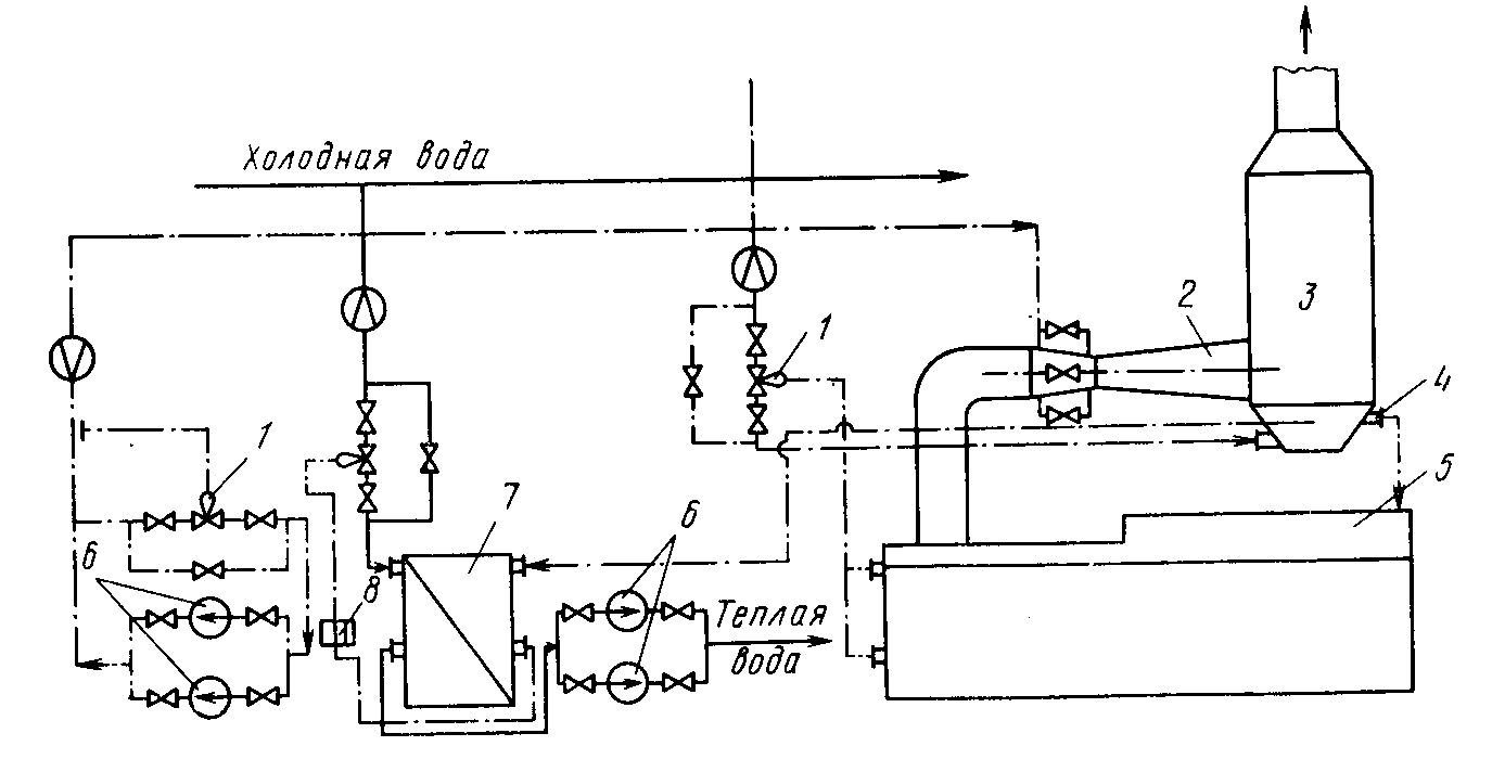 / — теплообменник; 2 — струйный газопромыватель второй ступени; 3 — струйный тазо-промыватель первой ступени; 4 — насос; 5 — дымосос; 6 — печь.