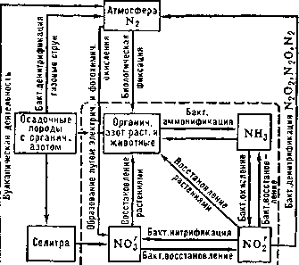 1) процессы электрического (в тихом разряде) и фотохимического окисления азота воздуха, дающие разные окислы азота (NO>2>, NO>3> и др.), которые растворяются в дождевой воде и вносятся т. о. в почвы, воду океана; 2) биологич. фиксация N>2> клубеньковыми бактериями, свободными азотфиксаторами и др. микроорганизмами. Первый путь даёт около 30 мг NО>3> на 1 м2 поверхности Земли в год, второй—около 100 мг NO>3> на 1 м2 в год. Значение азота в обмене веществ организмов общеизвестно. Он входит в состав белков и их разнообразных производных. Остатки организмов на поверхности Земли или погребённые в толще пород подвергаются разрушению при участии многочисленных микроорганизмов. В этих процессах органический азот подвергается различным превращениям. В результате процесса денитрификации при участии бактерий образуется элементарный азот, возвращающийся непосредственно в атмосферу. Так, например, наблюдаются подземные газовые струи, состоящие почти из чистого N>2>. Биогенный характер этих струй доказывается отсутствием в их составе аргона (40Ar), обычного в атмосфере. При разложении белков образуются также аммиак и его производные, попадающие затем в воздух и в воду океана. В биосфере в результате нитрификации — окисления аммиака и др. азотсодержащих органич. Соединений при участии Nitrosomonas и нитробактерий – образуются различные окислы азота.
