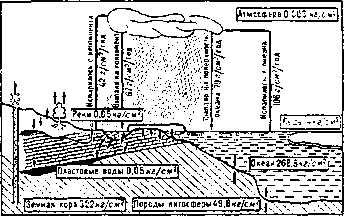 Рис. 4.1. Схема круговорота воды. Содержание воды дано в кг 1см1 в год на поверхности Земли. Испарение и выпадение осадков дано в г/см* в год на поверхность океана или континента соответственно.