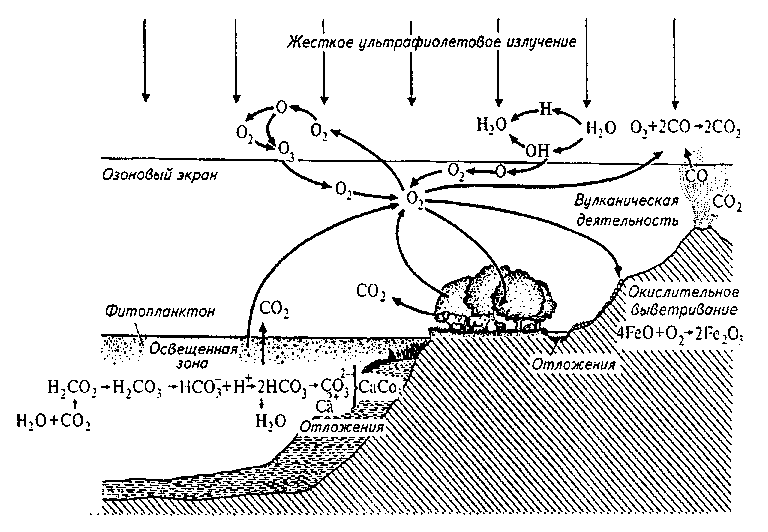 Рис. 4.4. Упрошенная схема некоторых путей круговорота кислорода на Земле (Клауд, Джибор, 1972)