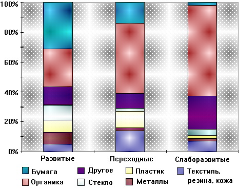 Состав и объем бытовых отходов чрезвычайно разнообразны и зависят не только от страны и местности, но и от времени года и от многих других факторов. Объемы бытовых отходов для некоторых стран приведены в таблице. Бумага и картон составляют наиболее значительную часть ТБО (до 40% в развитых странах). Вторая по величине категория в России – это так называемые органические, в т.ч. пищевые, отходы; металл, стекло и пластик составляют по 7-9% от общего количества отходов. Примерно по 4% приходится на дерево, текстиль, резину и т.д. Количество муниципальных отходов в России увеличивается, а их состав, особенно в крупных городах приближается к составу ТБО в западных странах с относительно большой долей бумажных отходов и пластика.
