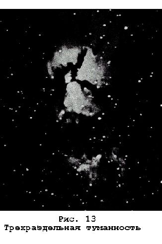 Существуют еще несколько видов туманностей, на которые они разделены, например, диффузные туманности. Такие диффузные туманности, как туманность Ориона (Рис. 4), Киля (Рис. 12), Трехраздельная (Рис. 13) - это сложные