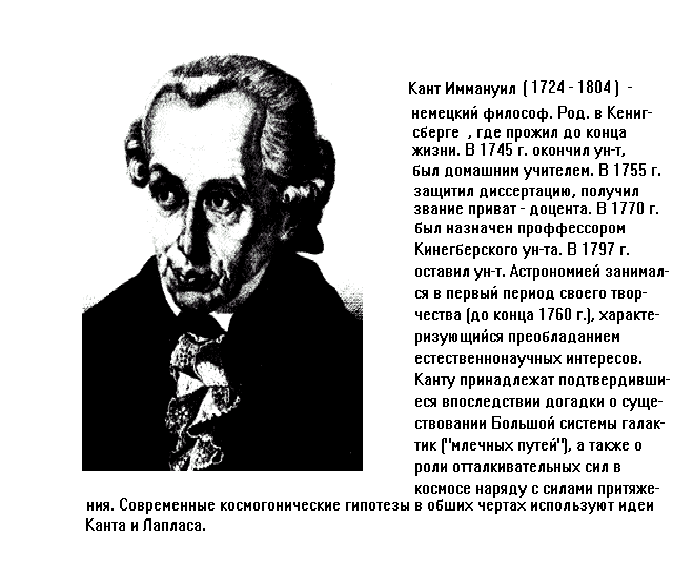 Многие ученые занимались вопросами практического отличия галактики от туманности. Свои теории создавали такие ученые как Т.Райт, Мопертюи, но наиболее продвинулся в этой области в свое время немецкий философ Иммануил Кант. Гипотезу Канта можно рассматривать как логическое развитие идеи Райта на основе физики Ньютона. Но затем Кант делает новый шаг, безусловно свидетельствующий о его богатом воображении. Трудно сказать об этом лучше самого Канта: