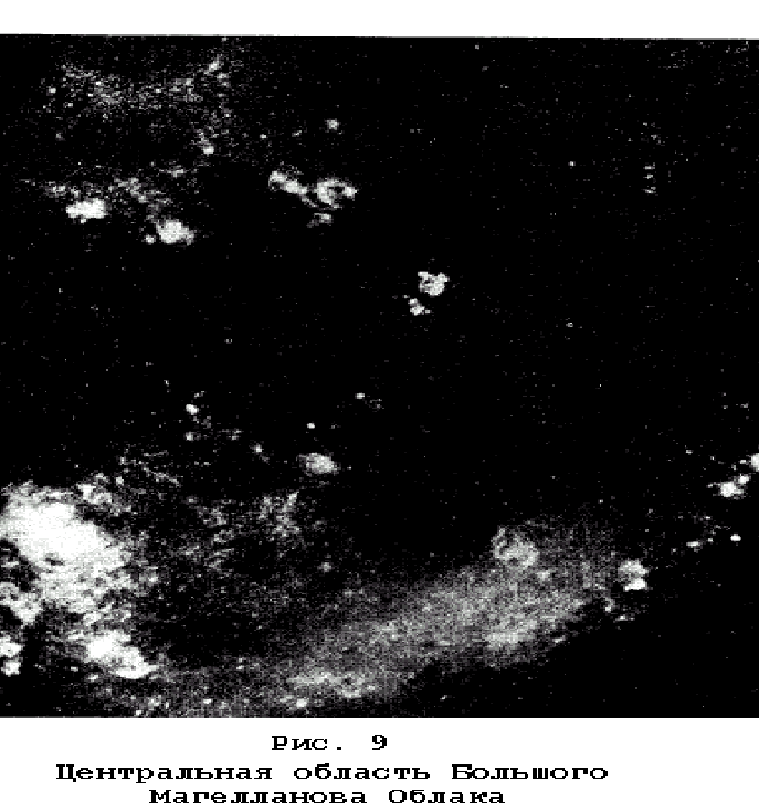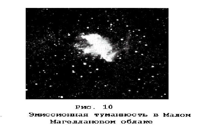 Бросающейся в глаза особенностью эмиссионных туманностей (туманность Ориона (Рис. 4) и Трехраздельная туманность (Рис. 7) принадлежат этому типу) является множество ярких эмиссионных линий в их спектрах. Эти спектральные линии являются как бы опознавательными “ярлыками”. Именно эти линии и привели к открытию туманностей во всех частях Млечного Пути и даже в далеких галактиках. Наилучшим образцом эмиссионной туманности может служить туманность Тарантул в Большом Магеллановом Облаке (Рис. 9). Туманности в Малом Магеллановом Облаке менее яркие и менее заметные (Рис. 11). Эмиссионная туманность излучает свет, характерный для вещества, из которого она состоит, если ее подходящим образом освещает звезда. Мы можем себе представить звезды как гигантские фонари, которые освещают смесь флуоресци-рующего вещества (атомы) и отражающих свет частиц (пыль). Непрерывные спектры эмиссион-ных туманностей, по-видимому, образуются не только вследствие отражения света от пылинок, но также в результате эмиссионных процессов, в которых принимают участие тяжелые атомы. Если свет “фонаря” богат ультрафиолетом, газ флуоресцирует и появляются яркие линии. Но когда присутствуют лишь сравнительно холодные звезды, то нет того изобилия ультрафиолетовой радиации, которую атом может поглощать и излучать заново в форме видимых ярких линий.