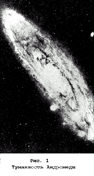 Кант утверждал, что, если бы “светящиеся пятна” представляли собой звезды гиганских размеров, их поверхносная яркость была бы гораздо больше наблюдаемой. Менее чем через 100 лет английский любитель астрономии Уильям Хаггинс сконструировал первый спектроскоп, пригодный для астрономических наблюдений, и использовал его для систематического изучения звезд и туманностей. Он обнаружил, что спиральные туманности, которые Кант отождествлял с далекими звездными системами, имеют, как предсказывал Кант, непрерывный спектр, подобный спектру обычных звезд. Спектры туманностей, которые выглядели как однородные и бесструктурные пятна даже при наблюдении в более мощные телескопы, наоборот, состояли из отдельных узких и ярких линий. Это были истинные туманности - протяженные облака горячего газа. В соответсвии с этим туманности разделяются на внегалактические (туманость Андромеды (рис.1)) и галактические - облака газа и пыли.