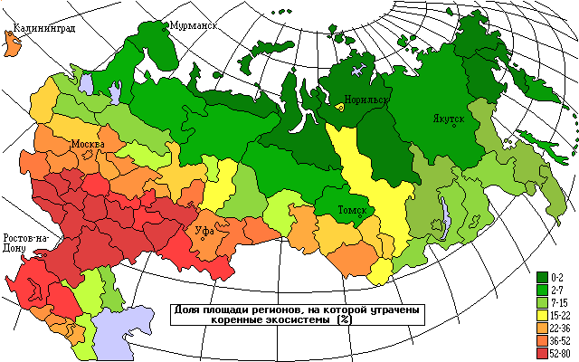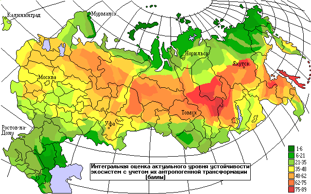 На приведенной карте видно, что потенциальная устойчивость экосистем России практически всюду в той или иной степени снижена за счет замены коренных типов экосистем, менее устойчивыми антропогенными производными (агроценозами или вторичными лесами) или полным уничтожением при застройке и урбанизации. При этом максимальные по площади воздействия характерны именно для районов с самыми устойчивыми природными комплексами. В России говорят: - “Кто везет, на того и валят”. Устойчивые экосистемы южной тайги и лесостепи России сохраняли возможность достаточно автономного, без подпитки со стороны, развития индустриальной цивилизации последних полутора веков несмотря на максимальную утрату природных комплексов.