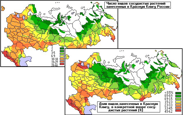 По современным оценкам флора сосудистых растений России составляет 11400 видов, причем ее инвентаризация далеко неполна. В Красную книгу внесено 440 видов покрытосеменных, 11 видов голосеменных и 10 видов папоротникообразных растений, то есть 4% флоры. Эксперты считают, что реально той или иной степени опасности подвергается не менее 2 - 3 тыс. видов сосудистых растений. Обилие видов сосудистых растений, внесенных в Красную книгу России достаточно оригинально. Помимо максимумов в центрах повышенного биологического разнообразия, куда заходят виды с сопредельных территорий (Кавказ, горы юга Сибири, Приморье, Сахалин и Курилы), имеются и региональные центры, не имеющие аналогов у других групп. Повышенное число редких видов растений характерно для степной зоны (обычно 15 - 30 видов), что, безусловно, обусловлено ее глубокой антропогенной трансформацией. Локальный максимум существует на Чукотке (11 видов) за счет проникновения сюда ряда американских видов, а также на южных берегах Финского залива и его остовах (27 видов), где произрастает значительное число западноевропейских растений. На огромных пространства Северной Сибири редких видов растений неизвестно. Максимальное число редких видов растений наблюдается в Приханкайской низменности - 66 и на западной оконечности российской части Кавказа - 65.
