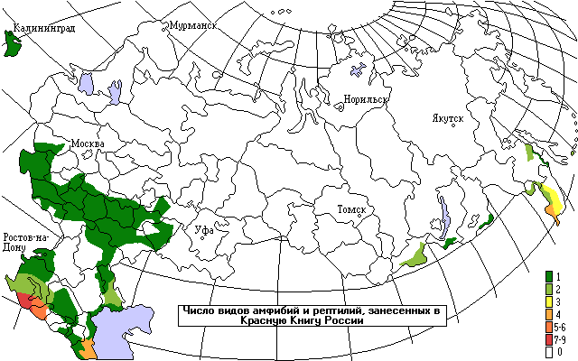 Амфибии и рептилии Красной книги России распространены почти исключительно на границах страны, давая максимумы разнообразия на западе и востоке Кавказа, а также юге Приморья. Исключение составляет лишь гадюка Никольского, заселяющая лесостепь и широколиственные леса Европейской России.