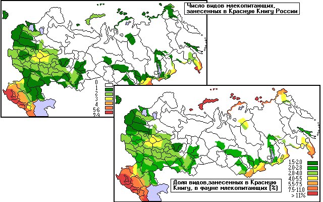 Редкие виды млекопитающих сосредоточены почти исключительно в Приморье, на Кавказе и в горах юга Сибири. Вне этих территорий нет регионов, где обитало бы более 3 редких видов, а огромные пространства тайги и тундры вообще таковых не имеют. Максимально разнообразие в Приморье - до 9 видов, на Кавказе - до 8, на юге Сибири - до 6.