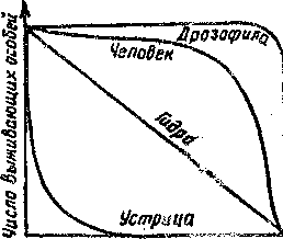 Третий тип смертности отличается повышенной гибелью взрослых, в первую очередь старых особей. Отличается он у насекомых, личинки которых обитают в почве, воде, древесине, а так же в других местах с благоприятными условиями, В экологии широкое распространение получило графическое построение «кривых выживания» (рис. 2). Откладывая по оси абсцисс продолжительность жизни в процентах от общей продолжительности жизни, можно сравнивать кривые выживания организмов, продолжительность жизни которых имеет значительные различия. На основании таких кривых можно определить периоды, в течение которых тот или иной вид особенно уязвим. Поскольку смертность подвержена более резким колебаниям и больше зависит от факторов окружающей среды, чем рождаемость, она играет главную роль в регулировании численности популяции.