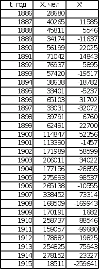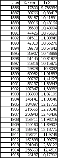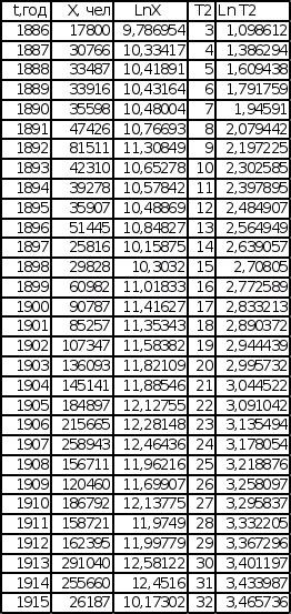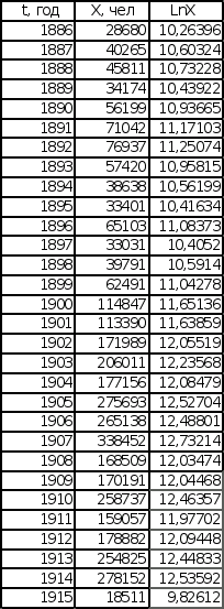 Графики зависимости lnX от t представлены на листе 2 (см. Приложение). Темп роста К, определенный по графикам, равен для графика зависимости Эмиграции в США из Центральной Европы – 0,11, для графика зависимости Эмиграции из СССР и стран Балтии – 0,13.