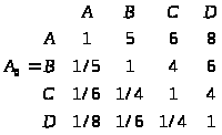 если суждение (относительно рассм. эл-ов) p>i> и p>j> таковы, что объект p>i> одинаков с объектом p>j> по важности, то элемент a>ij>=1, а значит а>ji>=1. В частности диагональный элемент а>ii>=1. Матрица А отвечающая правилам 1) и 2) называется идеальной матрицей сравнения.