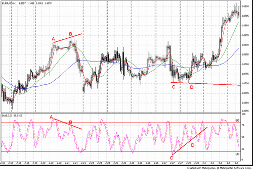 Если вернуться к графику, то видно, что очень сильные сигналы стохастика — это медвежье расхождение (прямая АВ и направление бычьего тренда), свидетельствующая об ослаблении силы быков и росте влияния медведей, и бычье схождение (прямая CD и направление медвежьего тренда), показывающее рост силы быков и ослабление медведей. Остановимся на них подробнее.