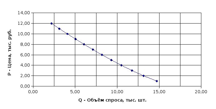 Для расчёта значений цены кривой спроса, примем исходные данные объёма спроса в диапазоне от 1 тыс. до 12 тыс. с шагом 1 тыс. руб.