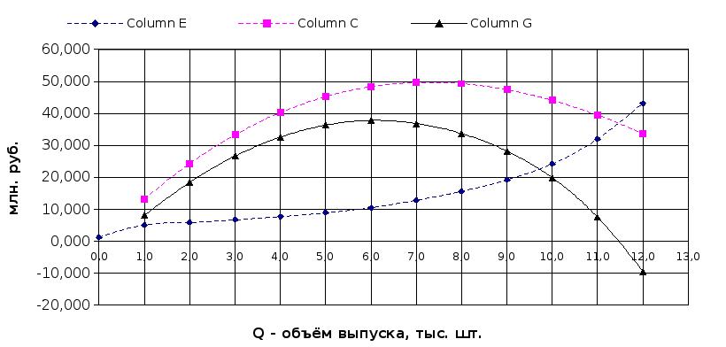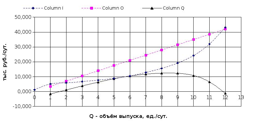 По приведённым ниже формулам произведём расчёт прибыли (убытков) фирмы при различных объёмах выпуска продукции. При расчёте будем использовать равновесную рыночную цену, определённую в предыдущем разделе работы.