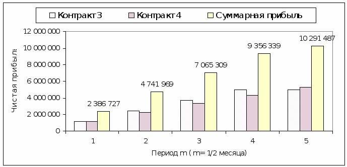 На данном графике отображены значения накапливаемой каждые полмесяца чистой прибыли планируемых внешнеэкономических операций 3 и 4 и их суммарной прибыли.
