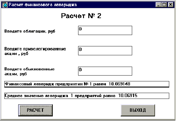 Если нужно вычислить среднее значение финансового левериджа для другой группы акционерных обществ, то необходимо выйти из программы ( нажав кнопку ВЫХОД) и запустить программу снова. Значение левериджа и среднего левериджа вычисляется с точностью до 10 знаков.