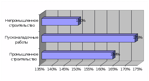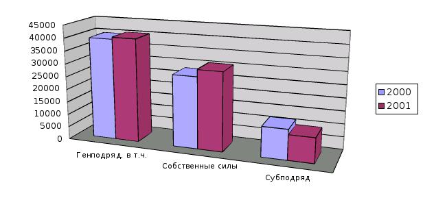 Ввод производственных мощностей на предприятии вырос по всем объектам в 2001 году по сравнению с 2000 годом. По некоторым их объектов этот рост составил от 200% до 300%. Также увеличилась доля работ, выполняемых собственными силами. Если в 2000 году она была 71%, то в 2001 – уже 76%. Доля промышленного строительства в общем объеме работ составила 69% и темп роста данного сектора строительной деятельности предприятия вырос на 50%.