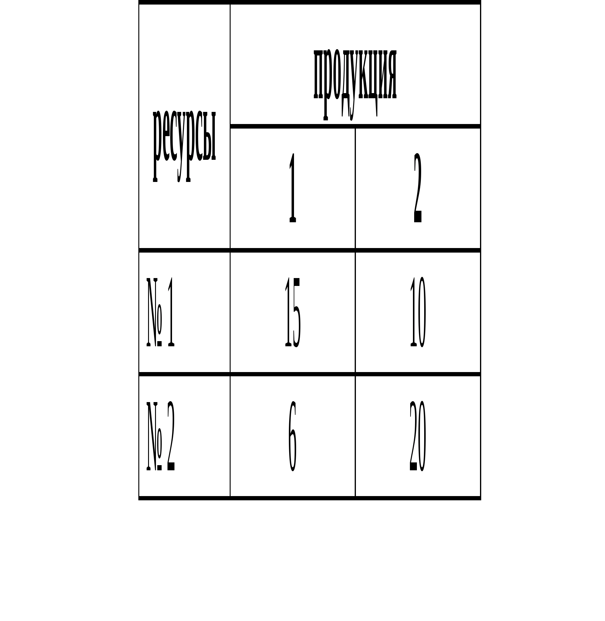 Определить наилучший план выпуска фирмы, производящей два вида продукции, использующей два вида ресурсов, реализующей продукцию по ценам 450 рублей и 400 рублей соответственно. Технологическая матрица задана в виде таблицы