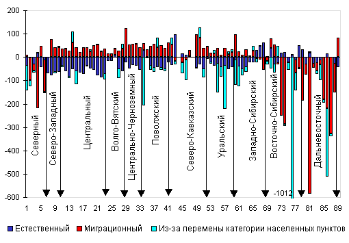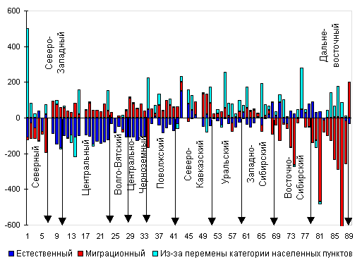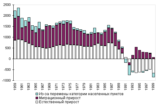 Среди городов с числом жителей от 100 до 500 тыс. человек убыль населения произошла в 72 городах из 131. Грозный был практически разрушен в результате военных действий, Колпино стало районом Санкт-Петербурга. Кроме этого, значительная убыль населения произошла в Магадане и Норильске (порядка 20%), Петропавловске-Камчатском и Мурманске (15%), Ухте и Прокопьевске (10-12%). Напротив, значительный прирост отмечался в Зеленограде (31%), Старом Осколе (23%), Нижнекамске, Элисте, Северске, Муроме и Белгороде (14-17%). Численность наличного населения Назрани - столицы Республики Ингушетии - в результате значительного наплыва беженцев из Чечни превысила 100 тыс. человек.