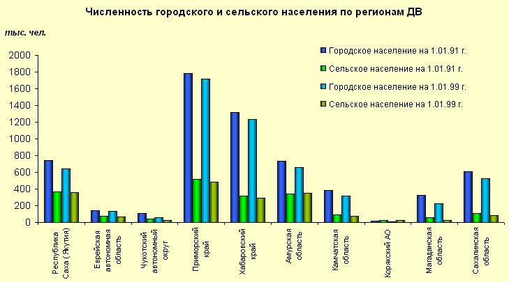 В 1998г. наибольшее сокращение населения произошло в Чукотском автономном округе (4,4%), в Магаданской области (2,3%) и в Сахалинской области (1,9%). Наименьшее сокращение наблюдалось в Хабаровском крае (0,7%), в Амурской области и Приморском крае (по 0,8%).