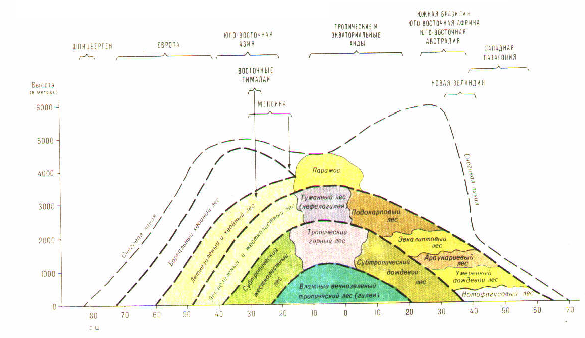 Схема распределения основных лесных сообществ на меридиональном профиле, в зависимости от высотной поясности и разных экологических условиях, по Троллю К.