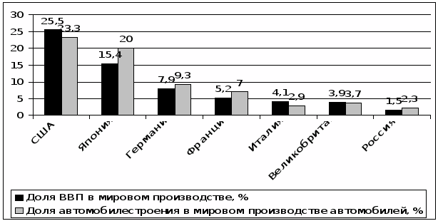 Заметные изменения произошли и в автомобилестроении. На первое место вышла Япония, обогнав США, затем Франция, Италия, Испания, Великобритания. Производство грузовых автомобилей сосредоточенно в США, Японии, странах СНГ, России и Канаде. Автосборка, помимо Бразилии и Республики Корея, в последние годы распространилась по всему миру. Значительно растет автомобилестроение в Китае, стимулируемое развитием автосборки в «свободных экономических зонах».