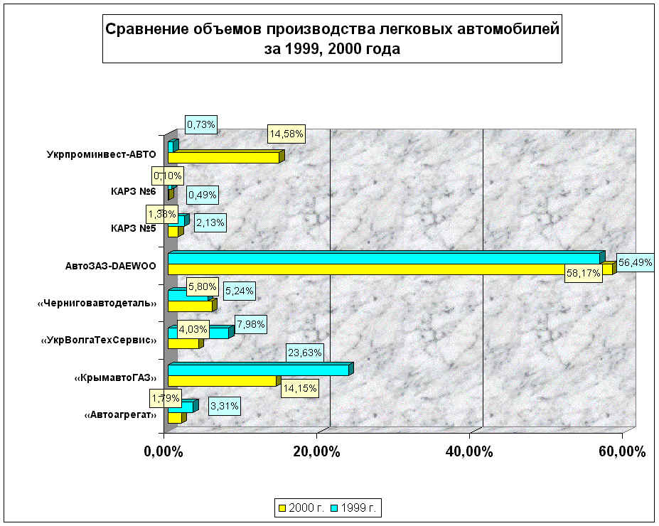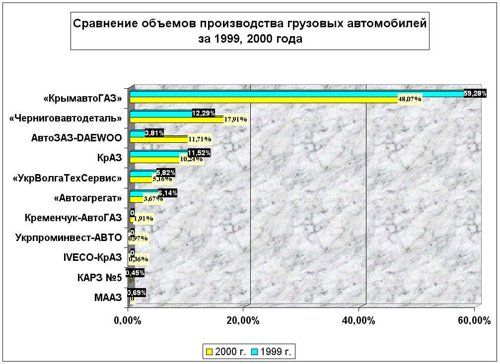 Підприємства автомобілебудування, що дісталися Україні в спадщину від розвинутого соціалізму (ЗАЗ, ЛуАЗ, ЛАЗ і КРАЗ), у 1999 році показали свою реальну життєздатність. Вони поступово нарощують свою частку в автовиробництві країни й досягли істотних успіхів. За 1999 рік частка традиційного автопрому зросла на 8% у виробництві легкових автомобілів, на 2% у вантажному автобудуванні, на 18% в автобусобудуванні. В умовах українського ринку ці підприємства змушені шукати нові економічні формули роботи і 2000 року став показником ефективності знайдених рішень. Крім того, тільки лише підприємства традиційної автопромисловості мають власну зовнішньоекономічну політику, тобто можуть поставляти автомобілі на експорт у ті країни, де такі автомобілі відповідають діючим стандартам. Більшість же складальних підприємств не можуть проводити власну експортну політику і змушені орієнтуватися тільки на український ринок. У першій половині 2001 року виробники України змогли зберегти темпи зростання виробництва автомобільної техніки. Так, частка легкових автомобілів в обсязі виробництва зросла на 1%, вантажних автомобілів збільшилася також на 1% і лише обсяг виробництва автобусів знизився на 2%. Спад виробництва автобусної техніки обумовлений кризою в області автобусних перевезень, що спричинило за собою скорочення виробництва на наступних підприємствах: “Черніговавтодеталь”, “Укрволгатехсервіс”, СП “IVECO-КрАЗ”, ЧАРЗ, “Автоагрегат” і “Оптіма”. У сформований обстановці тільки ЛАЗ і “Кримавтогаз” зумів зберегти обсяги випуску автобусної техніки.