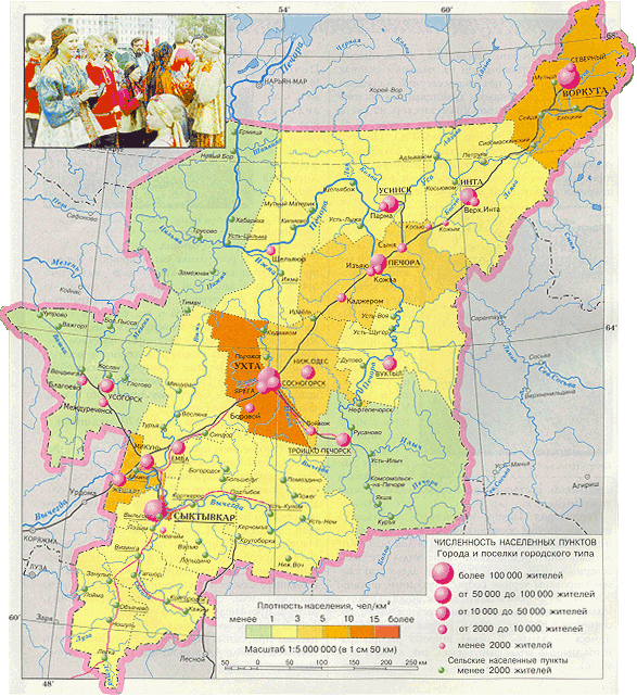 В административном отношении Республика Коми делится на 20 районов. Численность жителей в 1995 г. составила 1193,5 тыс.чел. (0,8 % населения России), в том числе: городское население - 890,9 тыс.чел., сельское - 302,6 тыс.чел. Государственные языки - коми и русский. Столица - город Сыктывкар (229,6 тыс.чел.).