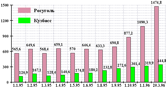 Заработная плата. Уровень среднемесячной заработной платы одного работающего в системе угольной промышленности Кузбасса в январе 1996 г. составил 1264,9 тыс.руб., что на 55,4 тыс.руб. (4,6%) выше, чем в среднем по угольной промышленности России. Темп роста зароботной платы по Кузбассу за 1995 г. составил 189,7% при среднем темпе роста потребительских цен 238% (по России 234%).