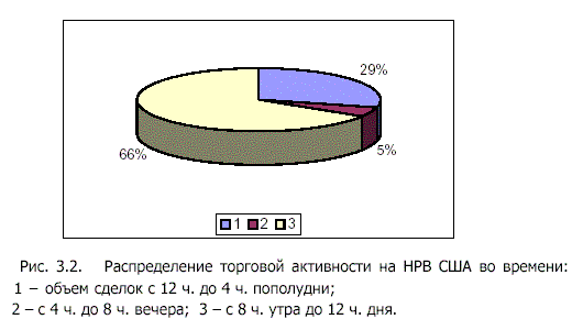Рынок наличных валютных сделок. Существует несколько причин популярности рынка наличных валют. Прибыль (или убыток) на этом рынке быстро реализуются, благодаря его волатильности (это мера склонности валюты к достижению определенной частоты флуктуаций цены в единицу времени. Представляет собой случайную составляющую изменения цены). Оборот на рынке наличной валюты стремительно возрастает благодаря сочетанию свойственной ему прибыльности и пониженного кредитного риска. Рынок наличной валюты характеризуется высокой ликвидностью (возможностью легко купить или продать данную ценную бумагу или актив), и высокой волатильностью. В течение мирового торгового дня (24 часов) курс евро/доллар может измениться 18 тыс. раз. Курс может «взлететь» на 200 очков за несколько секунд, если рынок оказался под воздействием сенсационной новости. Вместе с тем, курс может оставаться практически неизменным в течение длительного времени, даже в течение часа, если торговля на одном рынке почти закончилась и ожидается ее начало на другом. Такая ситуация является обычной для торгового дня в Нью-Йорке. Так как Калифорнии не удалось в конце 80-х годов создать связь между рынками Нью-Йорка и Токио, имеет место техническое торговое окно (gap) между 4ч. 30мин и 6ч. пополудни по восточному времени США. На рынке наличной валюты Соединенных Штатов большинство сделок заключается между 8ч. утра и полуднем, когда совпадают во времени нью-йоркский и европейский рынки (см. рис. 3.2). Активность рынка резко падает, практически на 50%, когда у Нью-Йорка отсутствует международная торговая поддержка. Ночная торговля ограничена по объему, поскольку весьма не многие банки имеют ночные смены. Большинство банков передает имеющиеся ночные заявки в свои филиалы или в другие банки, находящиеся в это время в рабочих часовых поясах.
