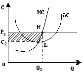 Если на каком-то интервале линия цены и предельного дохода располагается выше кривой средних издержек , то в точке равновесия М фирма будет получать квазиренту , т.е. прибыль , превышающую нормальный уровень . При оптимальном объеме производства Q>2> средние издержки будут равны С>2> , следовательно , валовые издержки составят площадь прямоугольника OC>2>LQ>2> . Валовая выручка (прямоугольник OP>2>MQ>2>) будет больше , и площадь заштрихованного прямоугольника C>2>P>2>ML покажет нам общую массу получаемой сверхприбыли .