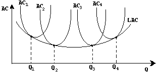 При возрастающей отдаче от масштаба производства пропорциональное увеличение всех затрат приводит к снижению средних издержек ( переход от кривой АС>1> к АС>2>> >) . При убывающей отдаче от масштаба , когда объемы производства слишком велики , пропорциональное увеличение всех затрат приводит к повышению средних издержек (переход от кривой АС>3> к АС>4> ). Многие отрасли характеризуются постоянной отдачей от масштаба в широких пределах изменения объема выпуска . В этом случае минимальные средние издержки при разных размерах фирмы одинаковы . U-образная линия LAC , огибающая все возможные краткосрочные кривые средних издержек , представляет собой долгосрочную кривую средних издержек : ее нисходящий участок соответствует возрастающей отдаче от масштаба , а восходящий участок – убывающей отдаче от масштаба . При изменении своего размера фирма каждый раз «переходит» на новую краткосрочную кривую АС и в то же время движется вдоль долгосрочной кривой LAC . Таким образом , изменяя величину всех вовлекаемых в производство ресурсов , фирма стремится оптимизировать свой размер и минимизировать долгосрочные средние издержки .