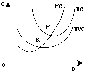Обратим внимание , что когда фирма ничего не производит , она несет только постоянные издержки . Если же она производит продукцию , то к постоянным издержкам добавляются переменные , но при этом фирма получает и некоторый доход от продаж . Поэтому , чтобы понять , когда фирма минимизирует убытки , надо сопоставить уровень цены не только со средними издержками (AC) , но и со средними переменными издержками (AVC) .