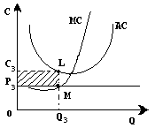 На третьем рисунке показана иная ситуация : средние издержки при любом объеме производства превышают рыночную цену . В этом случае даже при оптимальном объеме производства (МС=Р) фирма несет убытки , хотя они и меньше , чем при других объемах производства ( площадь заштрихованного прямоугольника P>3>C>3>LM минимальна именно при объеме производства Q>3>) .