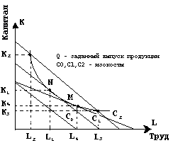 Фирма не может избрать изокосту С>0>> >, т.к. нет такого сочетания факторов , которое обеспечило бы выпуск продукции Q при их стоимости , равной С>0>> >. Заданный объем производства может быть обеспечен при расходах , равных С>2> , когда затраты труда и капитала соответственно равны L>2> и К>2> или L>3> и К>3> . Но в этом случае издержки не будут минимальными , что не отвечает поставленной цели . Значительно эффективнее будет решение в точке N , т.к. при этом набор факторов производства обеспечит минимизацию издержек производства . Сказанное выше верно при условии , что цены на факторы производства неизменны . На практике так не бывает . Предположим , что цена капитала увеличится . Тогда угол наклона изокосты , равный – (w/r) , уменьшится , а кривая С>1> станет более пологой . Минимизация издержек в данном случае будет иметь место в точке М со значениями L>4> и К>4> . В связи с увеличением цены на капитал фирма заменяет капитал трудом .