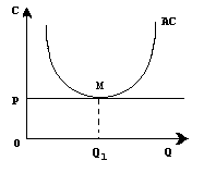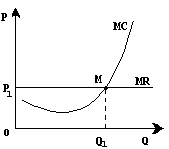 Ниже показано , что с увеличением производства кривая предельных издержек (МС) идет вверх и пересекает горизонтальную линию предельного дохода , равного рыночной цене Р>1> , в точке М , соответствующей объему производства Q>1>. Любое отклонение от этой точки приводит к потерям для фирмы либо в виде прямых убытков при большем объеме производства , либо в результате сокращения массы прибыли при уменьшении выпуска продукции .