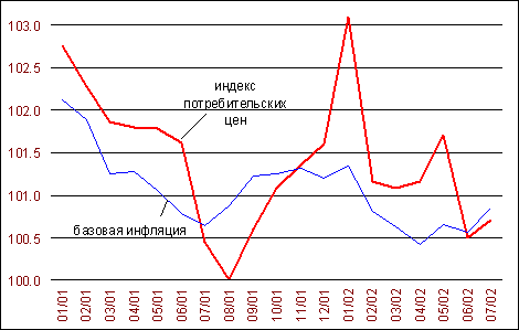 В период с 1996 года до конца августа 1998 года в России наблюдалось снижение темпа инфляции. Валютно-финансовый кризис, разразившийся вслед за другими странами в России в августе 1998 года, показал эфемерность официально объявленной финансовой стабилизации и победы над инфляцией. Глубокие экономические и социальные потрясения в их числе: замораживание выплат по внутренним и внешним долгам; крах рынка ценных бумаг и финансовых пирамид; блокирование вкладов в крупных банках, кризис банковской системы и безналичных расчетов; увеличение безработицы; «бегство» капитала за рубеж; девальвация рубля привели к усилению инфляции с 11 % в 1997 году до 70 % в 1998 году. В 1999 году темп инфляции составил 36,5 %. Замедление темпов инфляции было обусловлено снижением платежеспособного спроса в связи с падением реальных располагаемых денежных доходов населения (в декабре 1998 г. на 31,8 % по сравнению с декабрем 1997 г.), контролем за денежной эмиссией и динамикой денежных агрегатов относительной стабилизацией валютного курса рубля. В июле 2002 года на потребительском рынке не произошло ожидавшегося сокращения динамики цен, не говоря уже об их абсолютном снижении. Хотя инфляция в общем-то невелика, обращает на себя внимание ее тенденция: вместо сезонного спада, индекс потребительских цен даже чуть вырос – со 100.5% в июне до 100.7% в июле (2001 г., соответственно: 101.6% и 100.5%). Базовая инфляция тоже несколько увеличилась – со 100.6% до 100.9% (самый высокий уровень, начиная с января) – см. график, табл. Такая динамика цен определялась в основном конъюнктурными факторами.