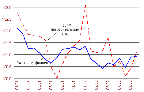 Ускорение инфляции в октябре связано со следующими обстоятельствами: интенсивным расширением денежного предложения во втором и третьем кварталах. Во втором квартале среднемесячный рост налично-денежной массы составлял 105.4%, в третьем – 101.4%. Следствием этого стал ускоренный рост цен на непродовольственные товары, добавивший к показателю инфляции на потребительском рынке 0.3 проц. пункта; ростом цен на молочные продукты и сахар-песок, имеющим преимущественно сезонную природу. В результате этого индекс потребительских цен увеличился на 0.2 проц. пункта; ускоренным повышением регулируемых тарифов на платные услуги населению (особенно, пассажирского транспорта). Это добавило к индексу потребительских цен 0.3 проц. пункта.
