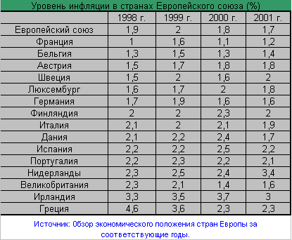 Ползучая (умеренная) инфляция, для которой характерны относительно невысокие темпы роста цен, примерно до 10% или несколько больше процентов в год. Такого рода инфляция присуща большинству стран с развитой рыночной экономикой, и она не представляется чем-то необычным. Данные за 70-е, 80-е и начало 90-х гг. по США, Японии и западноевропейским странам, как раз и говорят о наличии ползучей инфляции. Средний уровень инфляции по странам Европейского сообщества составил за последние годы около 3-3,5%;