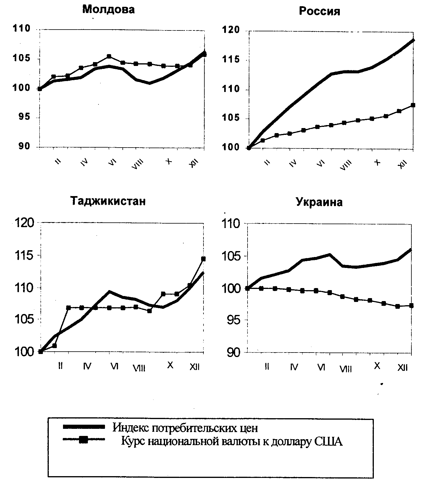 После финансового кризиса августа 1998 г. Инфляцию стал определять курс рубля, именно его падение вызвало вспышку цен в августе-сентябре и продолжающийся их рост в октябре-ноябре. Денежная масса в августе была ниже, чем в начале года. Неплохая иллюстрация применения принципов монетаризма в России. Падения рубля было результатом двух существенных факторов: образования большой краткосрочной задолженности нерезидентам (естественно в долларах) и отставания «коридорного» курса рубля от уровня инфляции. Кроме того, негативное воздействие оказала необходимость очередных (и значительных) платежей по долгосрочному внешнему долгу в соответствии с прежними соглашениями.