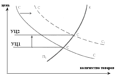 Допустим, что экономика близка к полной занятости и загруженности производственных мощностей. Рост расходов населения, предприятий и государства на потребление смещает кривую совокупного спроса вверх из положения СС в положение СС>1 >(рис.1). Соответственно, наблюдается и рост цен, положение которых в конечном итоге зафиксируется на уровне УЦ>» >.