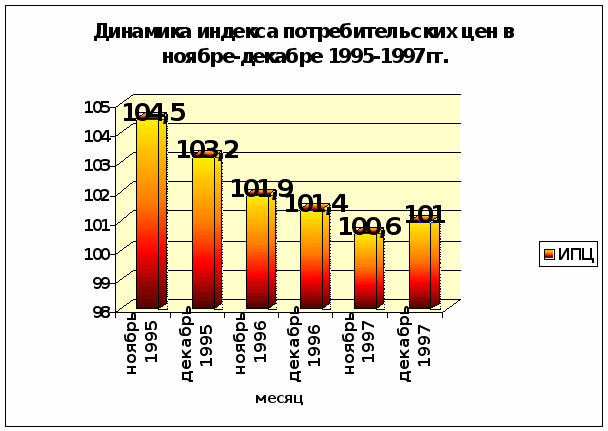 В конце 1997г. произошел рост общего индекса потребительских цен со 100,6% в ноябре до 101% в декабре. На протяжении двух предыдущих лет картина складывалась прямо противоположная – в 1995г. индекс потребительских цен в ноябре был равен 104,5%, в декабре – 103,2%; в 1996г. аналогичные показатели составили соответственно 101,9 и 101,4%.