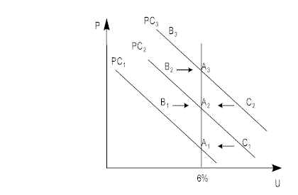 В условиях более высокой ожидаемой 6-ти % инфляции краткосрочная кривая Филипса перемещается от PC>1> к РС>2>. Таким образом по кривой Филипса типа А>1>-В>1> движение идет кратковременно. В долгосрочном плане после того, как номинальная з/п догонит рост цен - безработица вернется к естественному уровню в точке А>2> и новая краткосрочная кривая Филипса РС>2> будет существовать при более высоком ожидаемом уровне инфляции. Возможно повторение процесса, если правительство решит, что определенные внешние случайные причины разрушили его стимулирующую политику, и оно предпринимает еще одну попытку. Тогда инфляция восстановится, но уже на уровне А>3> и т.д.