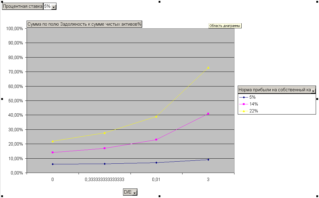 Построение графика нормы прибыли на собственный капитал как функции задолженности к сумме чистых активов для трех значений нормы прибыли на чистые активы.
