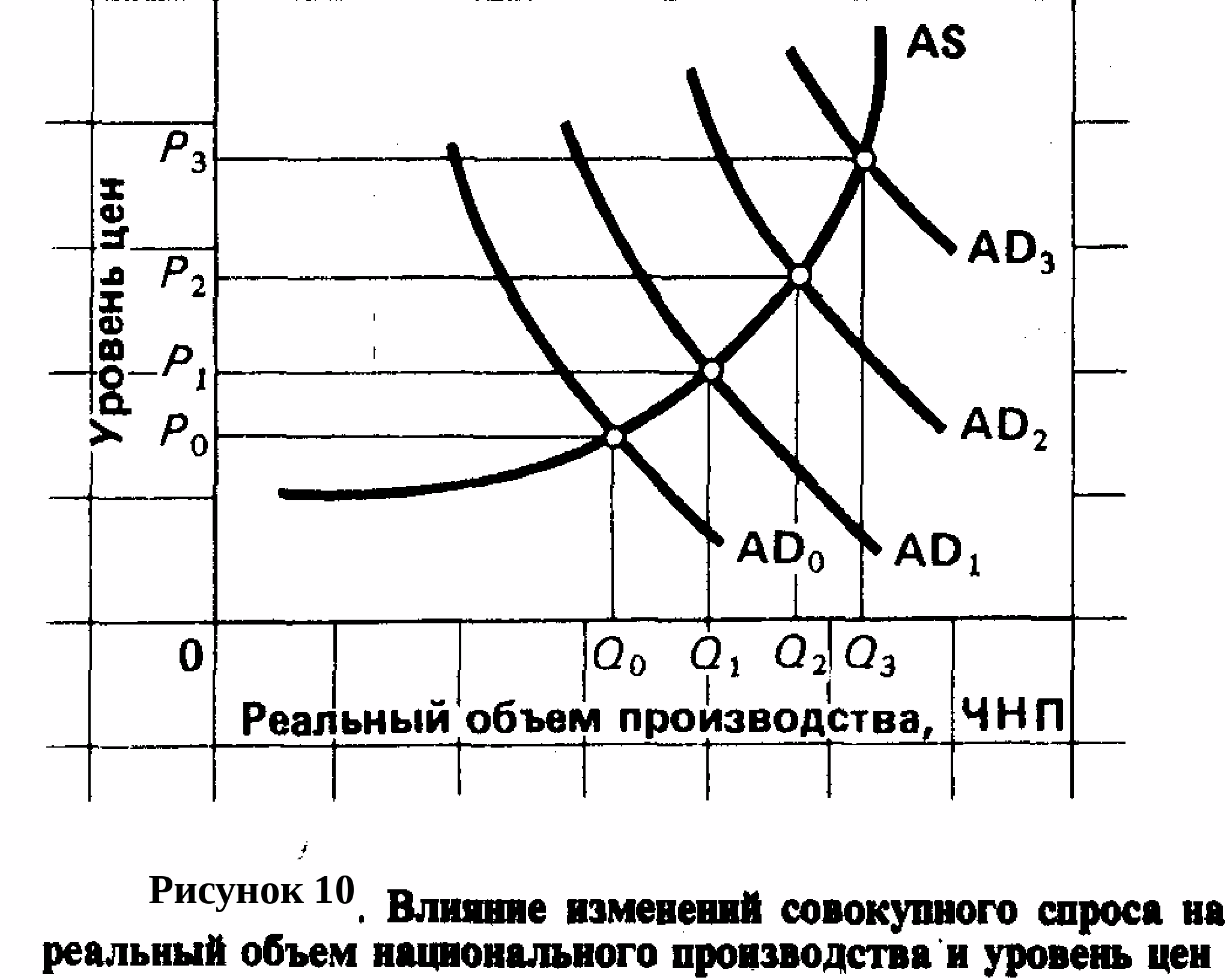 Например, предприниматели могут принять решение о покупке большего количества инвестиционных товаров или правительство может решить увеличить свои расходы для обеспечения большего объема общественных товаров. Какова бы ни была причина увеличения совокупного спроса, мы видим рост уровня цен с Р0 до Р1, тогда как реальный выпуск возрастает с Q0 до Q2.