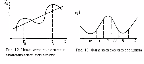 Промежуток времени между двумя одинаковыми состояниями экономической конъюнктуры называется экономическим циклом. В структуре цикла выделяют высшую (пик) и низшую точки активности и лежащие между ними фазы спада (рецессии) и подъема (экспансии). Особенно глубокий и продолжительный спад называют депрессией. Общая длительность цикла измеряется обычно временем (в месяцах) между двумя соседними