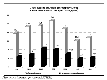 С учетом многочисленных нарушений таможенного режима, широкого распространения льгот и высоких объемов неорганизованной торговли в середине 90-х годов, по имеющимся данным, примерно 60% всего импорта (официального и челночного) и более 90% потребительского импорта осуществлялось в обход стандартных таможенных пошлин или вообще беспошлинно. В результате отечественные производители неоправданно поставлены в равные конкурентные условия с обладающими значительно большими финансовыми, технологическими и другими возможностями зарубежными фирмами.